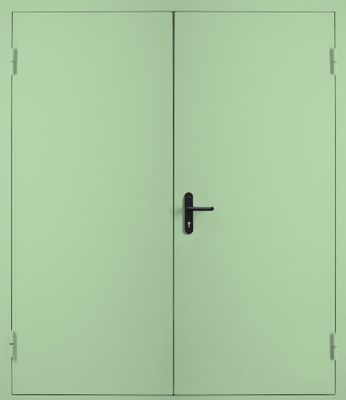 - Глухие двупольные огнестойкие двери состоят из коробки, двух полотен, внутренних наполнителей, деталей фурнитуры. Размеры зависят от места монтажа. Чаще всего их устанавливают на запасном эвакуационном входе, лестничной клетке, лифте, тамбуре. Поэтому конструкция имеет нестандартные параметры.